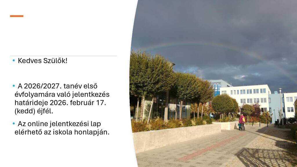Szeretettel hívjuk: Külsős felvételi tájékoztatót tartunk, NEM Rózsakerti Demjén István Református Általános Iskolába járó tanulóknak és szüleiknek, a felvételi eljárás rendjéről. Helyszín: a gimnázium aulája. Időpont: 2025. október 21. 17:30. Helyszín: a gimnázium...